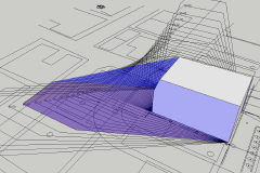 確認申請用実施設計図のSketcUpによる簡易モデルと北側斜線Volumeの合成による、直感的に分かりやすい法規チェック、道路斜線の天空率による緩和に関する再確認