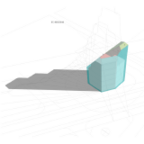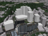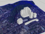 ArchiCAD による 3D volume model データを SketchUp 形式データで受取, GoogleEarth のジオロケーション(緯度・経度)および基準点の標高データをもとに配置設定, KMZ形式データの作成.