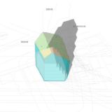 都市計画道路の整備に併せ, 沿道街区において, 用途地域の変更や高さの制限・高度地区指定・日影規制条件等, 想定条件によるボリュームおよび日影シミュレーション. SketchUp による最大ボリュームの modeling.
