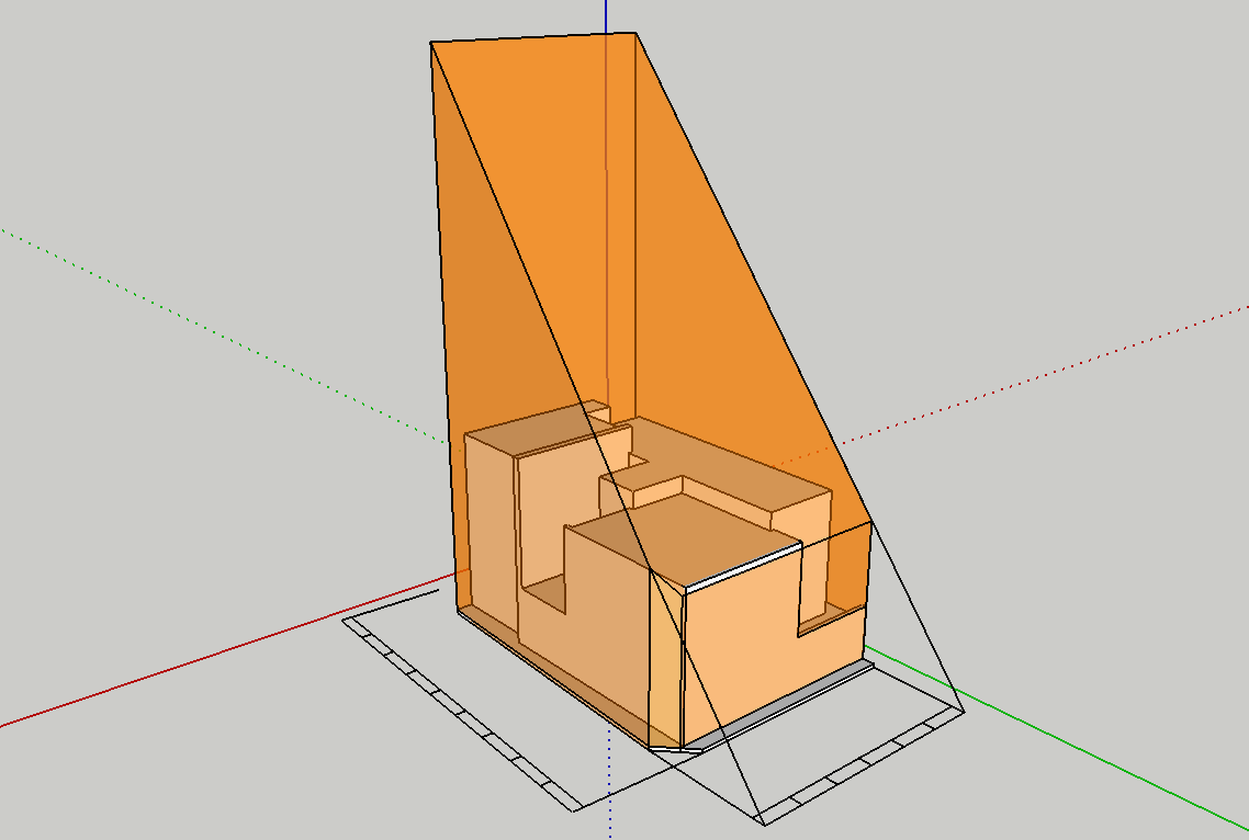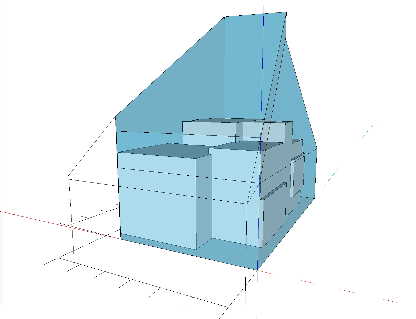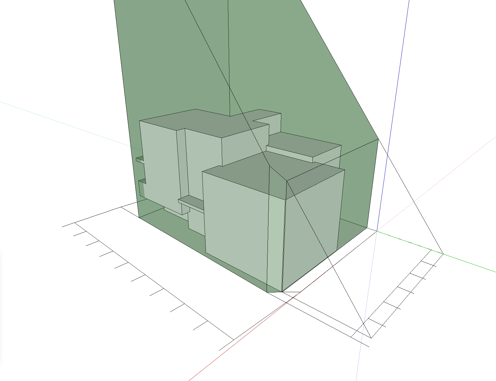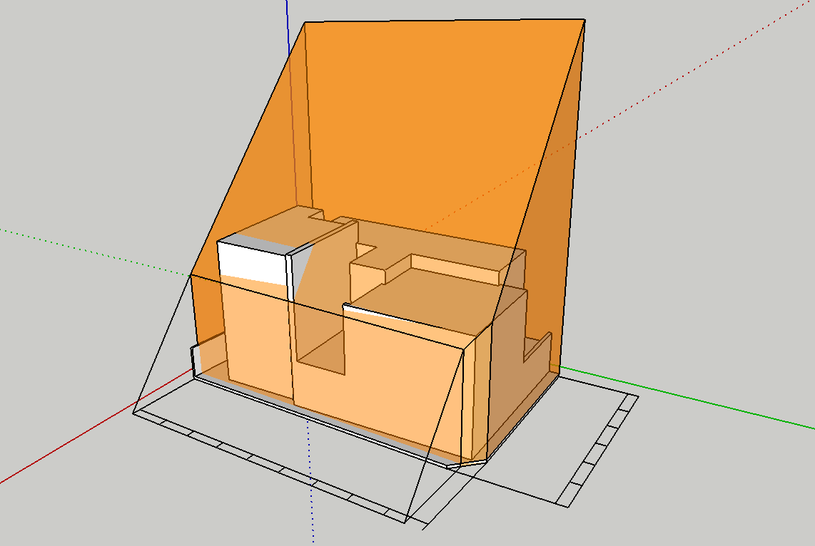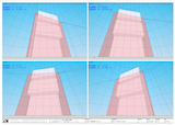 基本設計初期段階における、ボリュームチェック。北側斜線および、北・東2方向道路斜線の SketchUp による天空率緩和チェック。