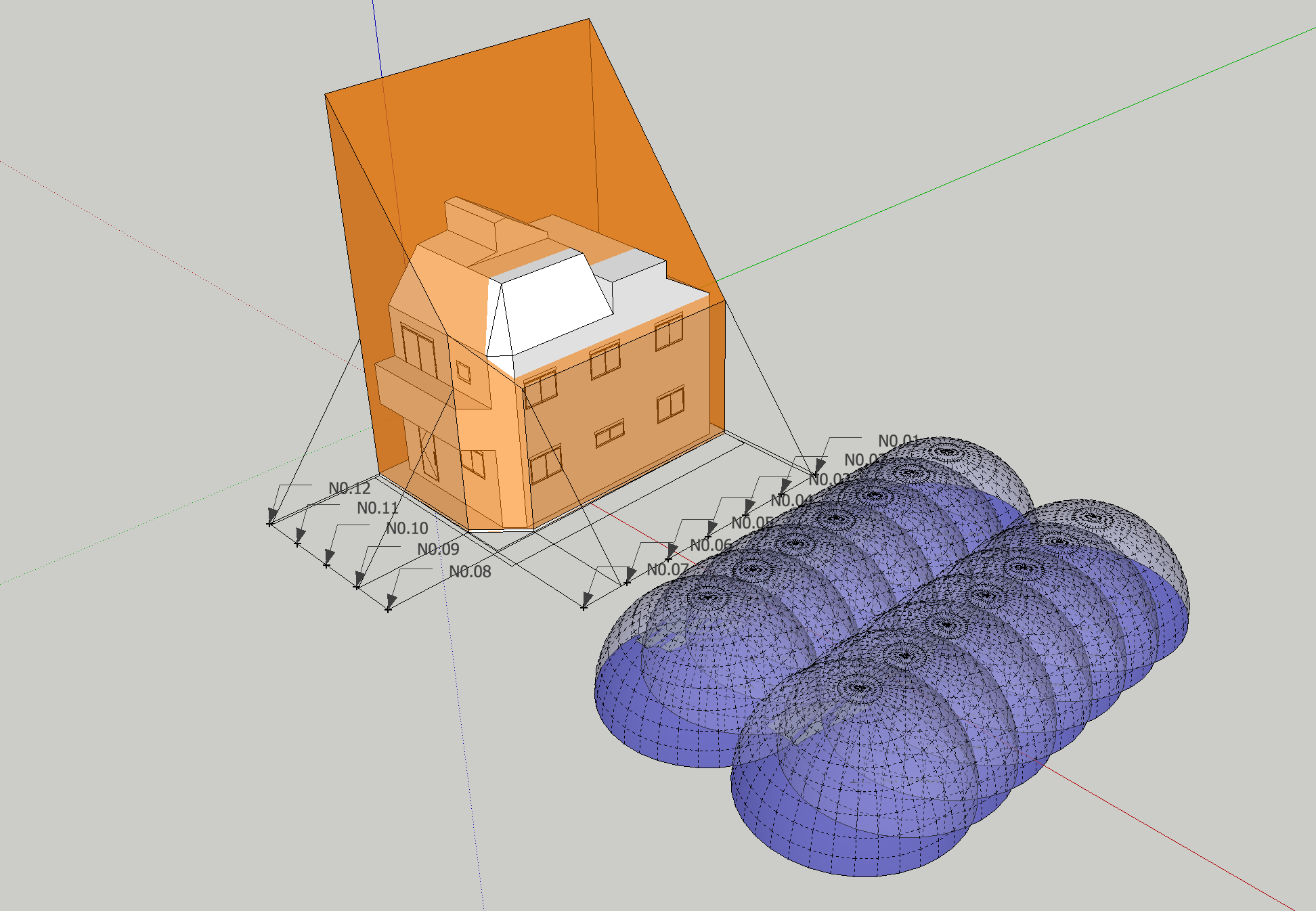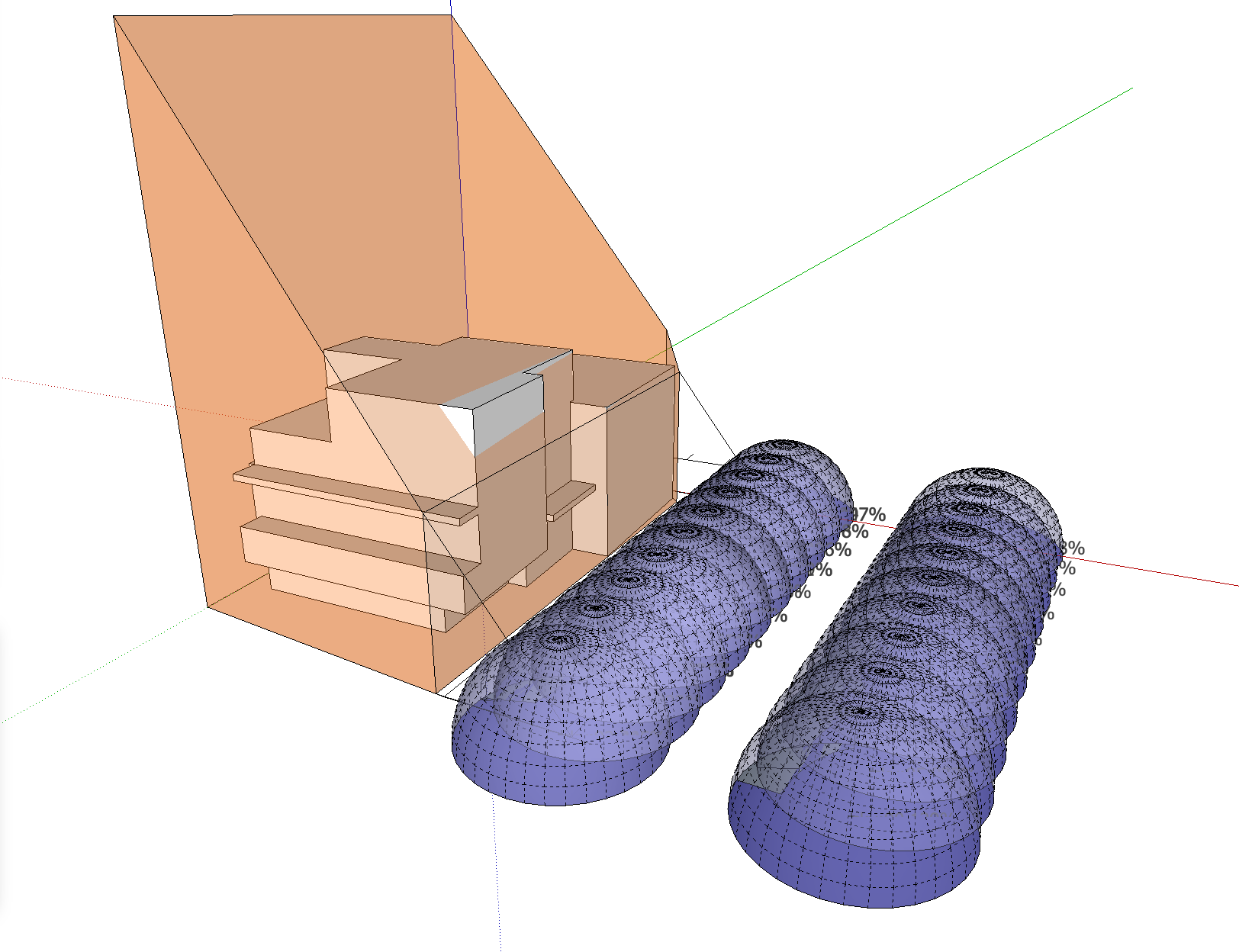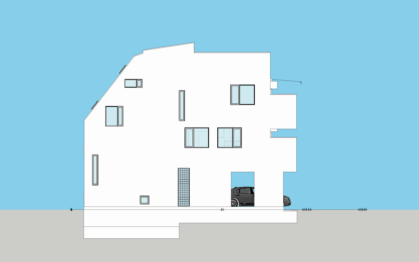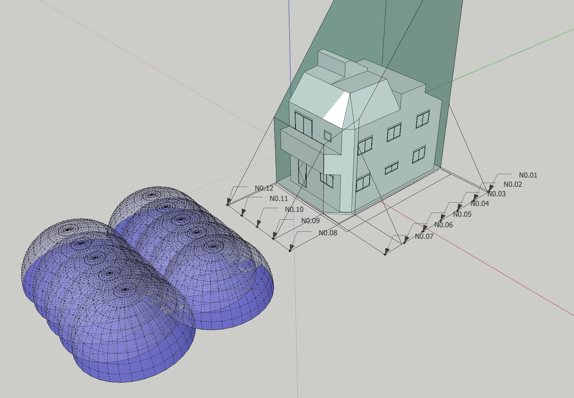 基本設計初期段階における、ボリュームチェック。北側斜線および、北・東2方向道路斜線の SketchUp による天空率緩和チェック。