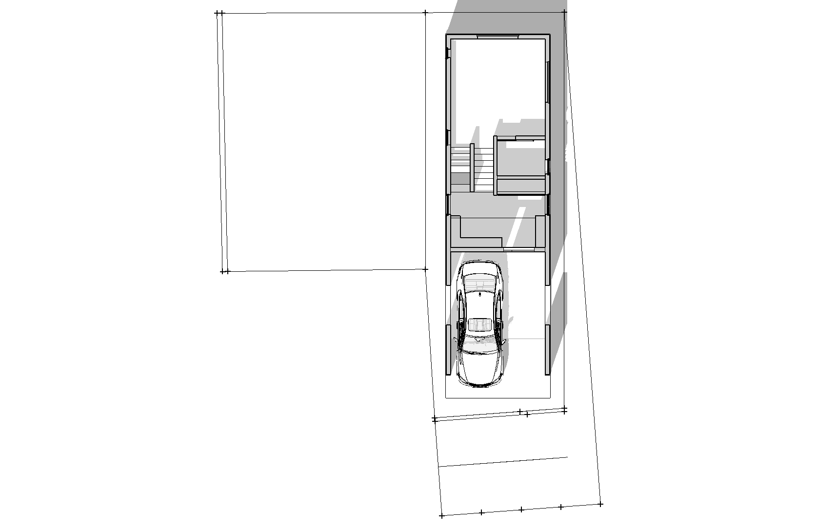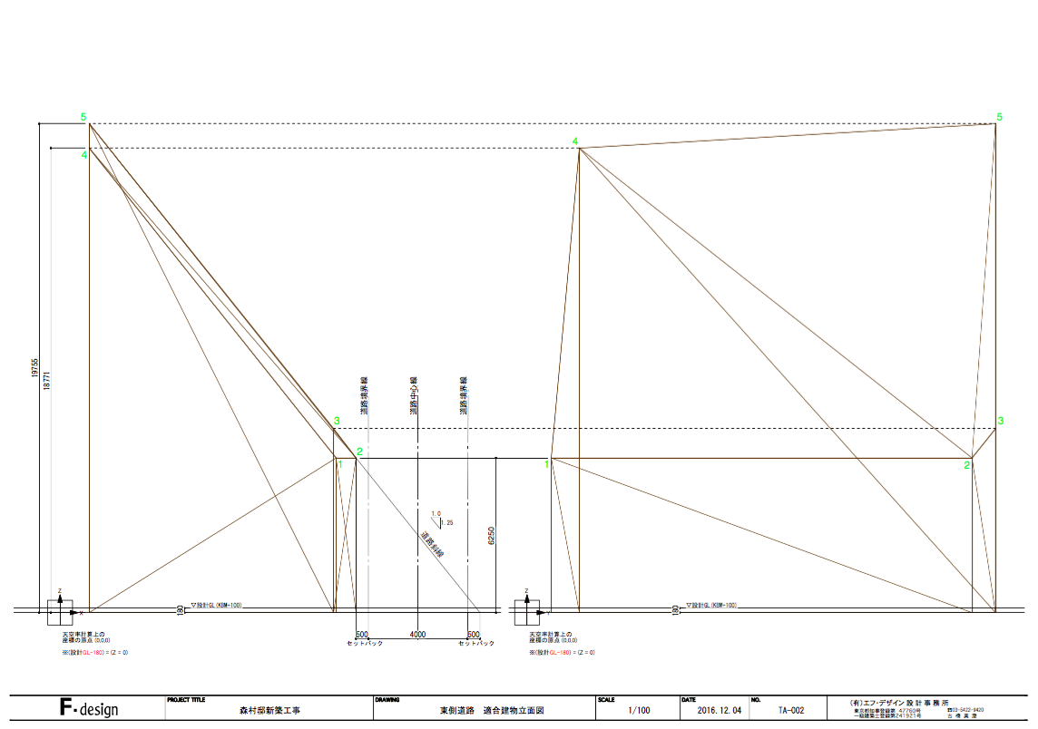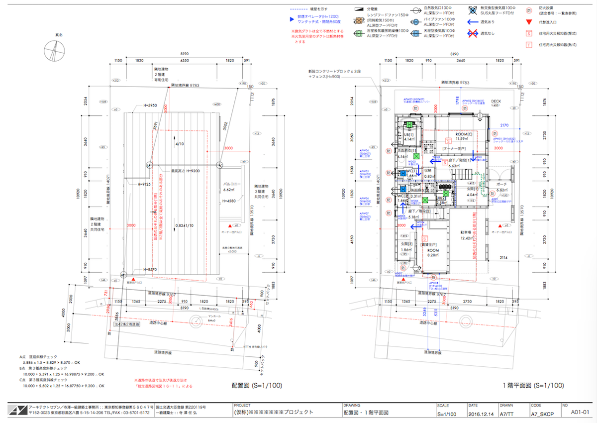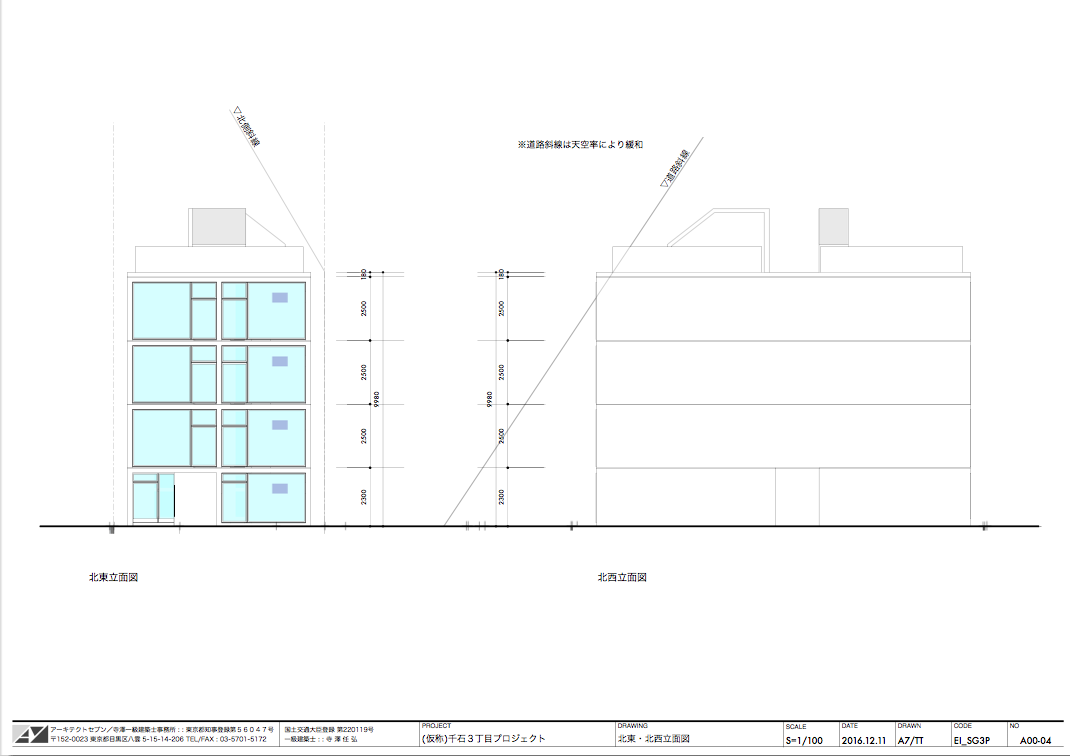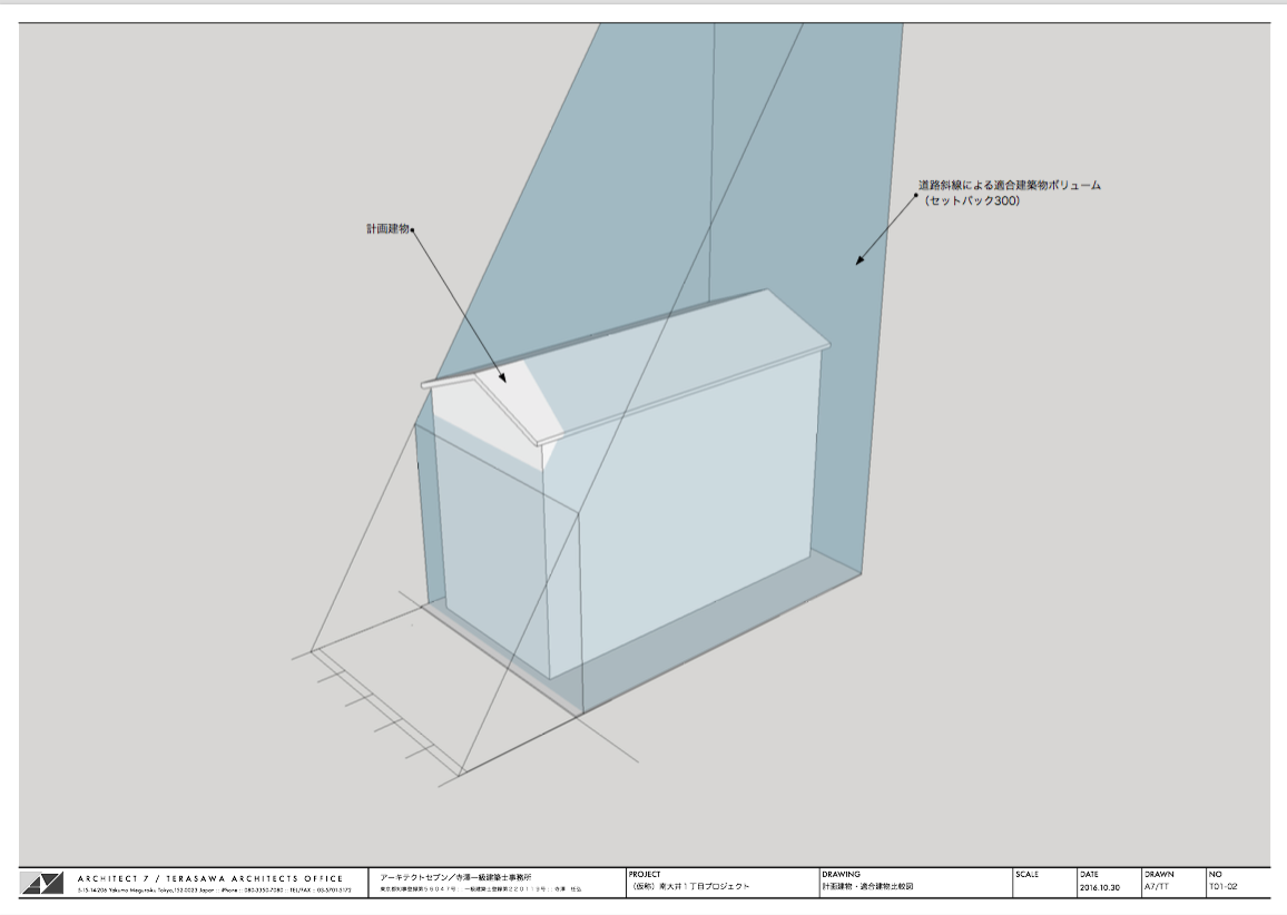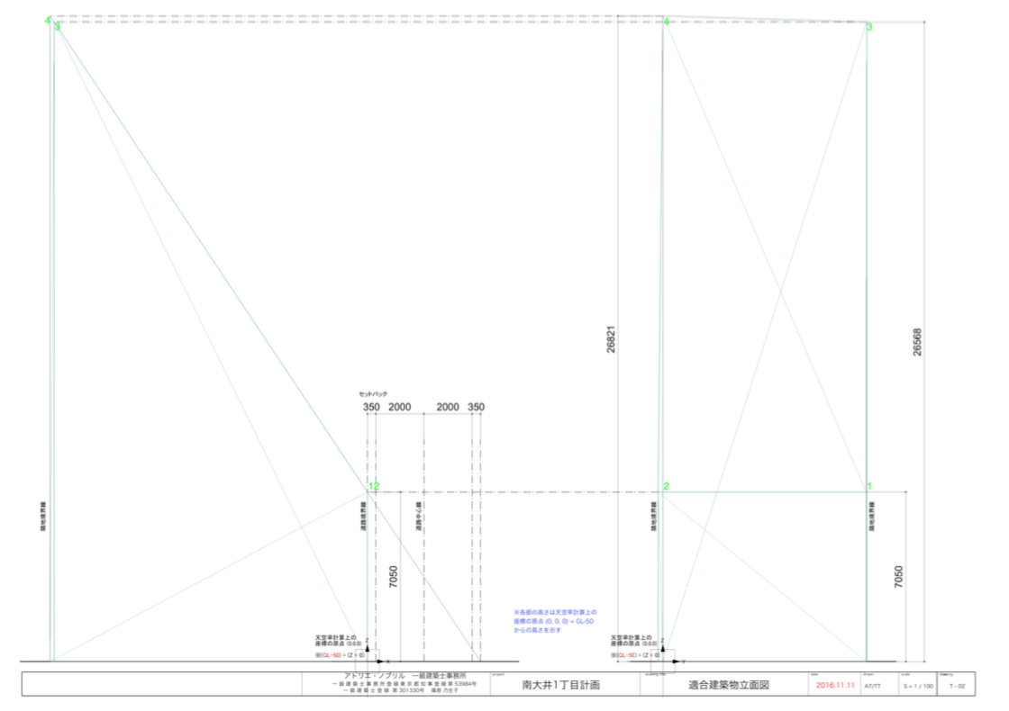 片側における道路斜線の天空率による緩和チェック。天空率をクリアできる屋根形状のスタディ、北側斜線のチェック。確認申請資料の作成。