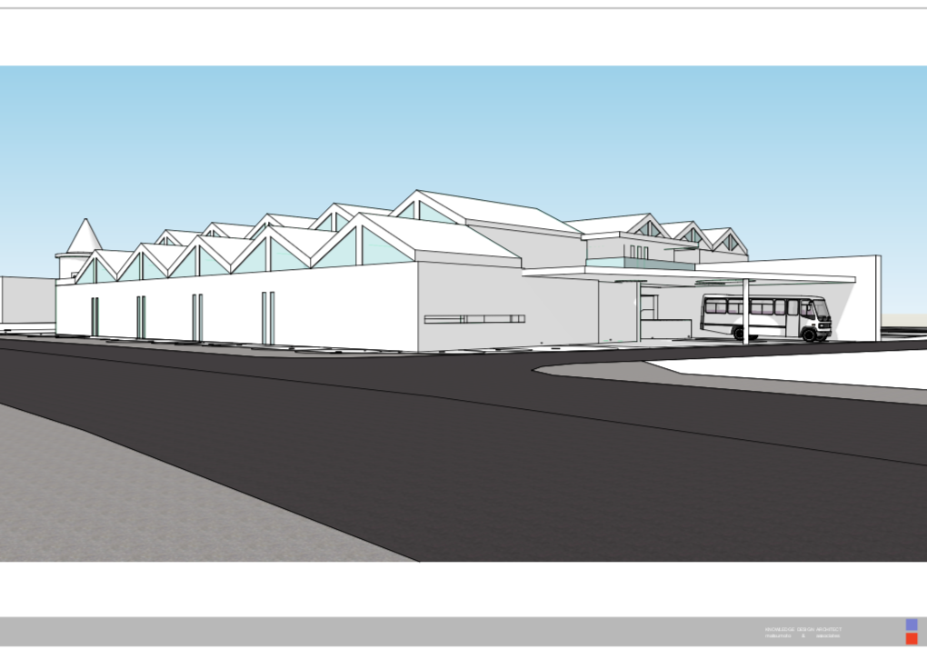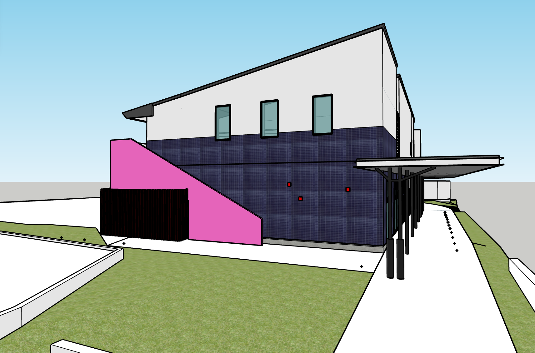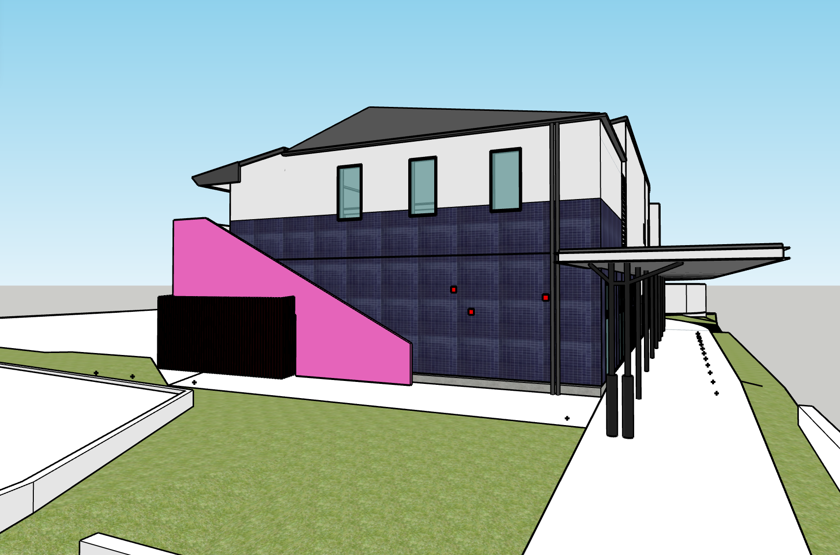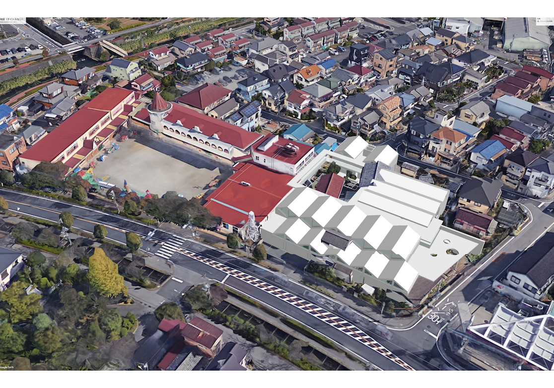 プールのある幼稚園の増築提案。SketchUp モデリングによる外観デザインスタディ、LauOut によるプレゼンテーション資料作成。モデルデータを GoogleEarth に配置して既存建物との合成。
