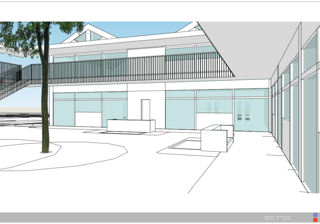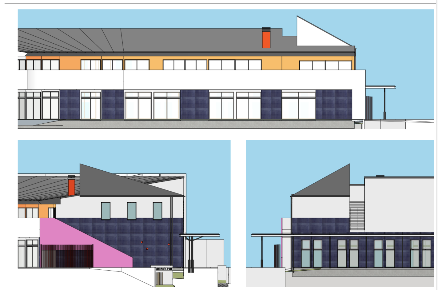 竣工したこども園の屋上部分の増築計画の検討. SketchUp により打合せを進めながらリアルタイムモデリングにより方針検討. 2案提案, SketchUp モデルデータを LayOut により図面化, プレゼンテーション資料作成.