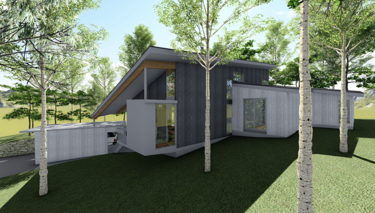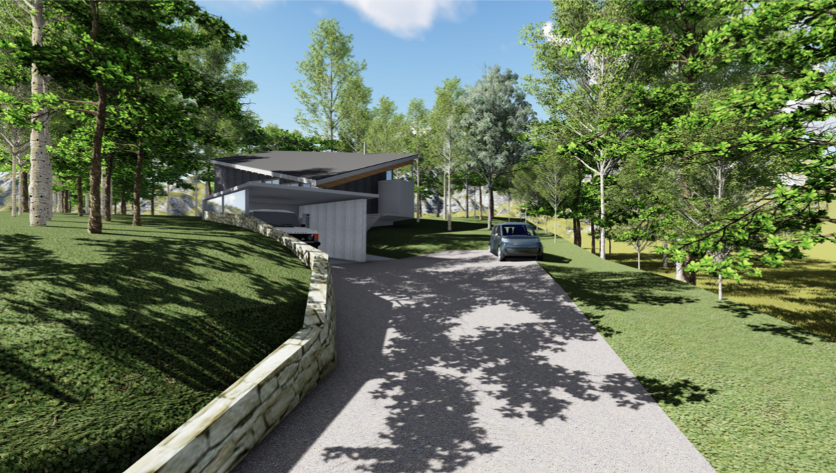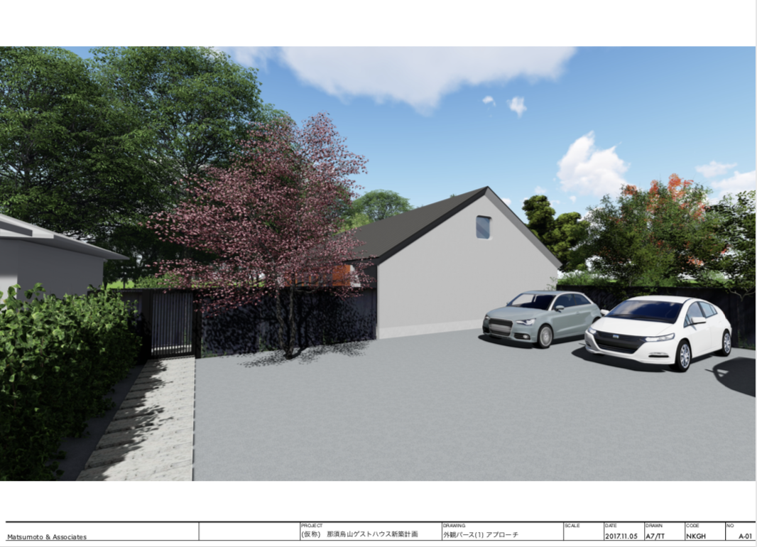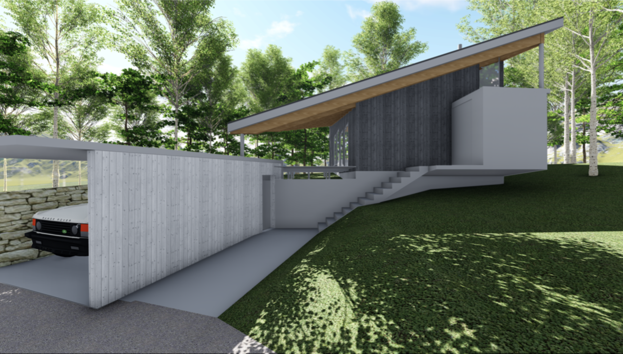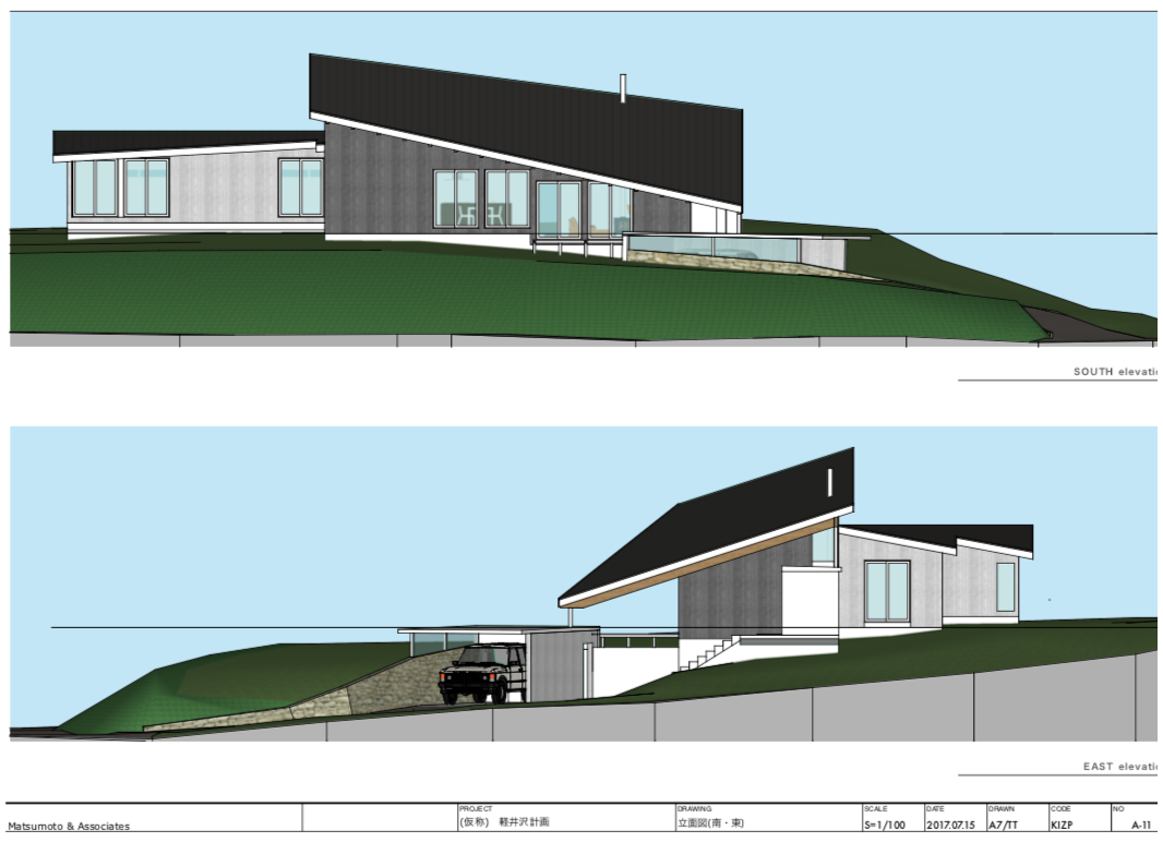 別荘地の住宅の設計・デザイン提案。SketchUp により敷地レベルから地形作成、レベル差をふまえたボリューム検討、プランニング、モデル作成、LayOut により一般図(配置図、平面図、立面図、断面図)プレゼンテーション資料作成、Lumion によるレンダリング、オーナープレゼンテーション。