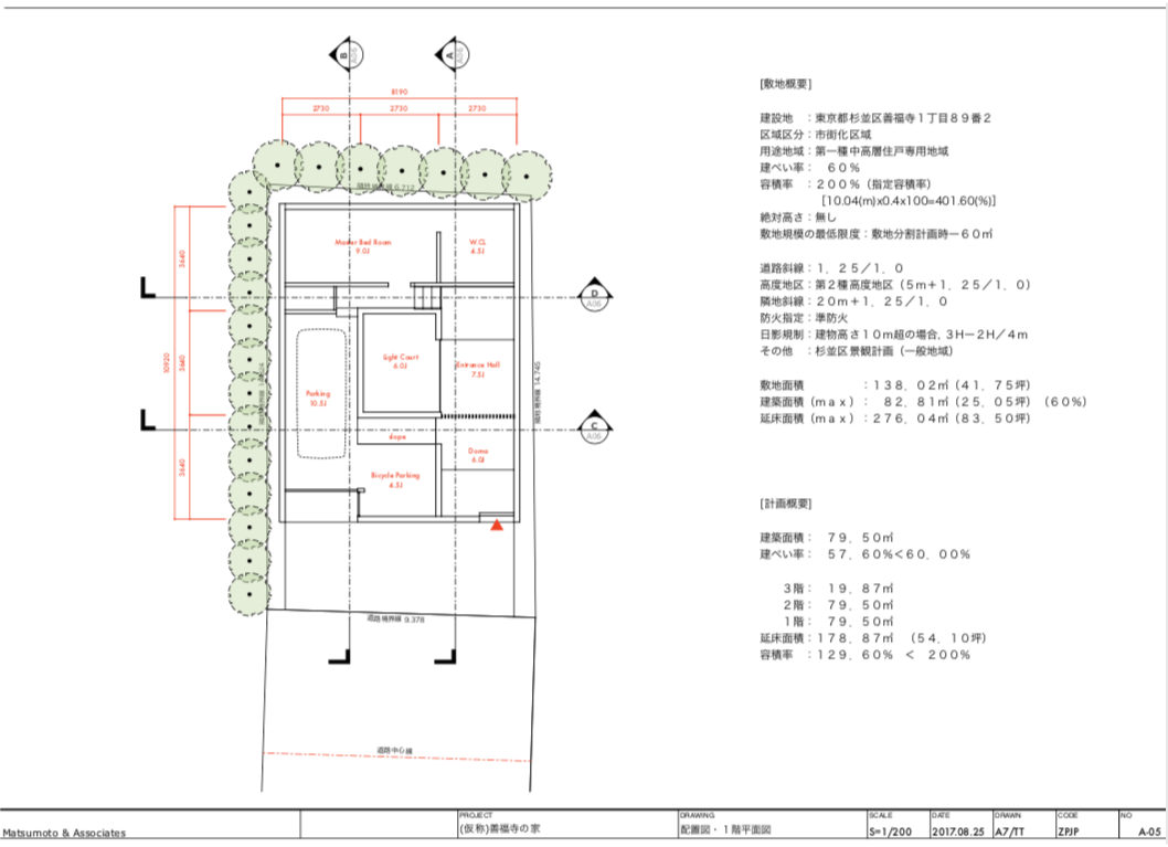 ルーフデッキのある木造3階建住宅. 2方向道路斜線の天空率によるボリュームチェック、プランニングをふまえてクリア可能な建物形状の提案