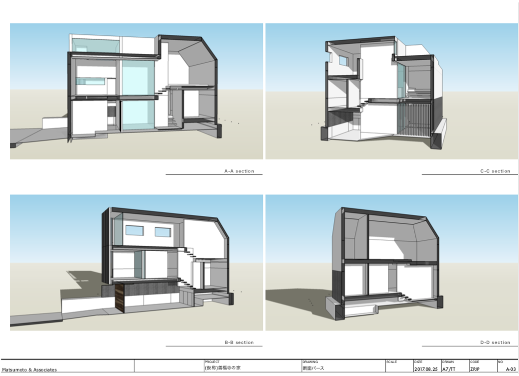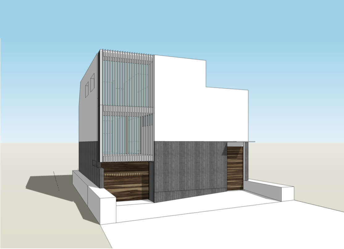 住宅の設計・デザイン提案。SketchUp によりボリューム検討、プランニング、モデル作成、LayOut により一般図(配置図、平面図、立面図、断面図)プレゼンテーション資料作成。