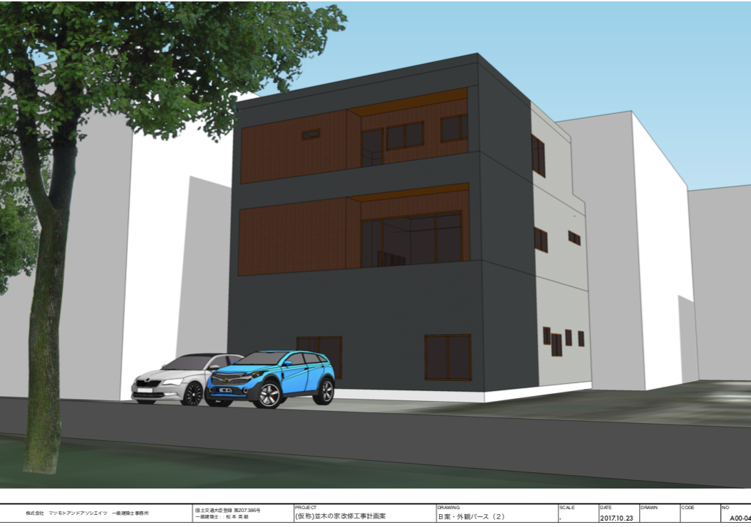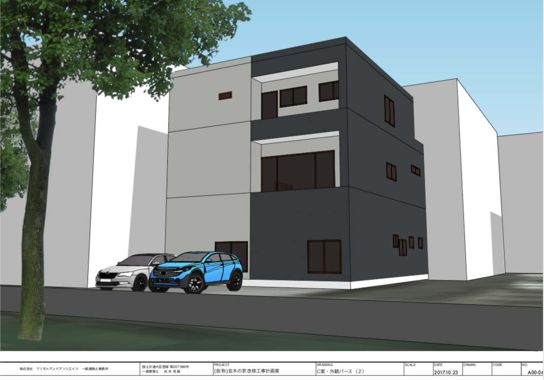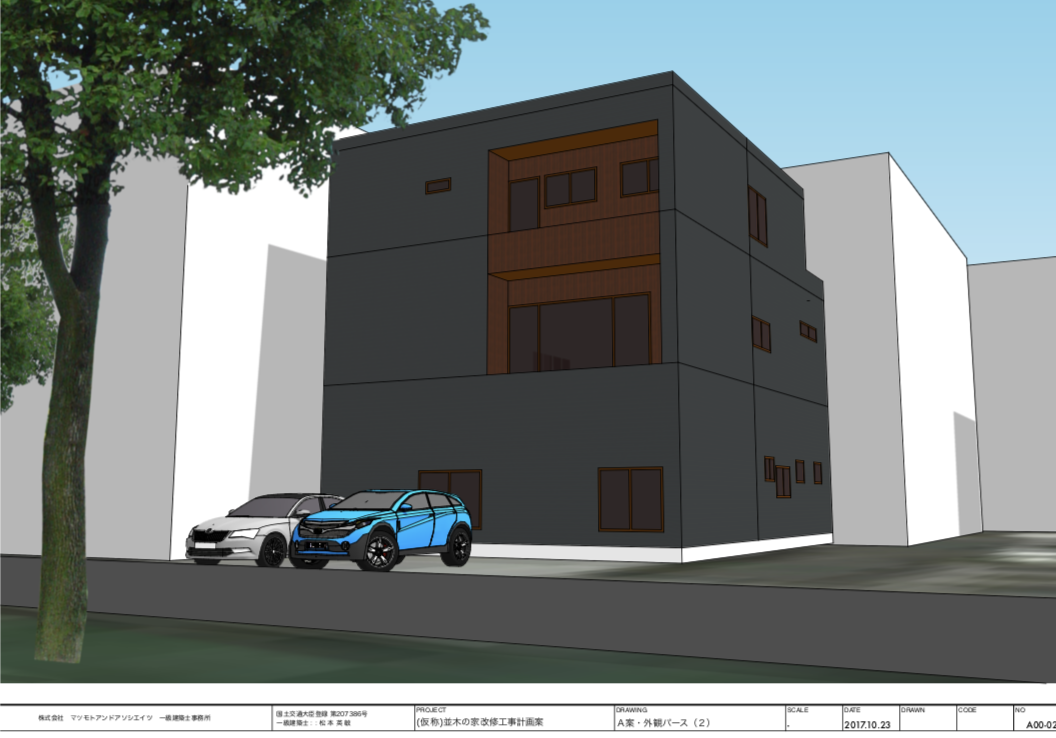 外装リニューアルデザイン提案。SketchUp によりデザイン検討、プランニング、モデル作成、LayOut によりプレゼンテーション資料作成。