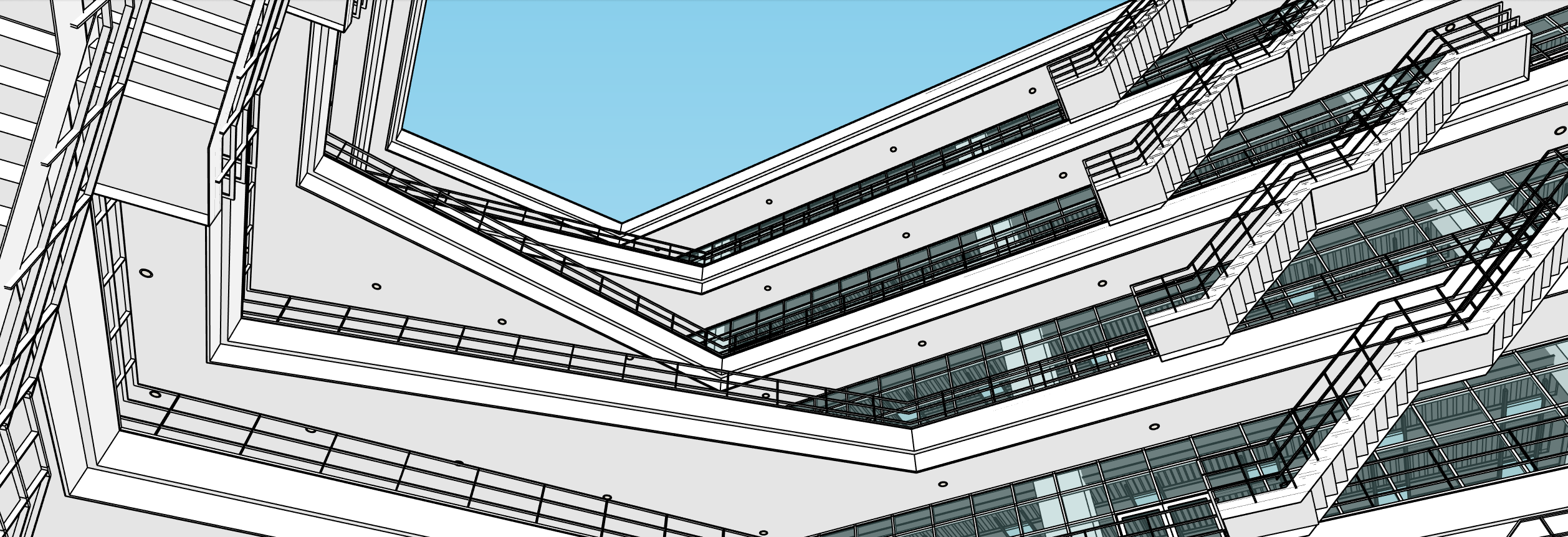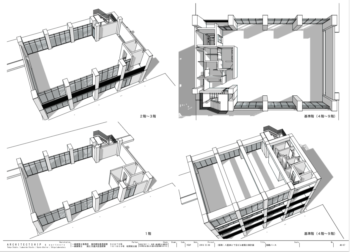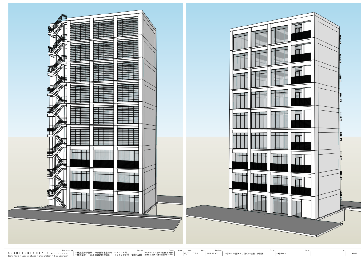 SketchUp による道路斜線・北側斜線ボリュームチェック, 基本設計モデリング, KeyShot によるプレゼンテーション用レンダリング, LayOut によるドキュメント作成, SketchUp データ納品, modeling 手法のレクチャ