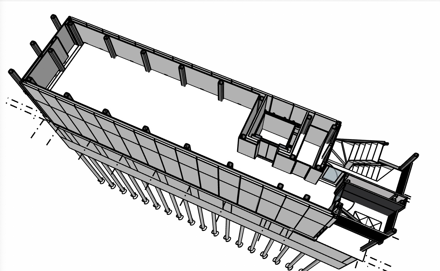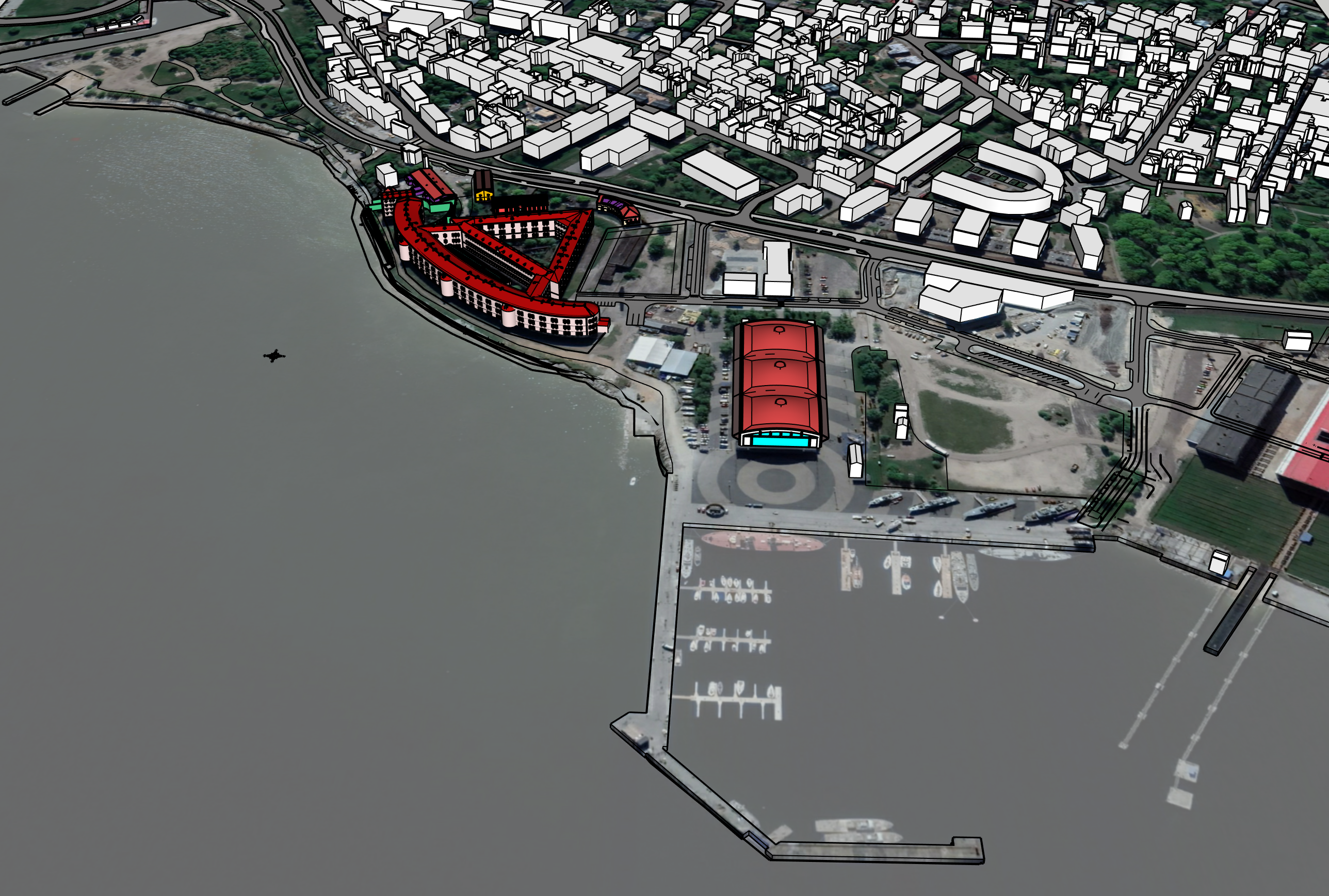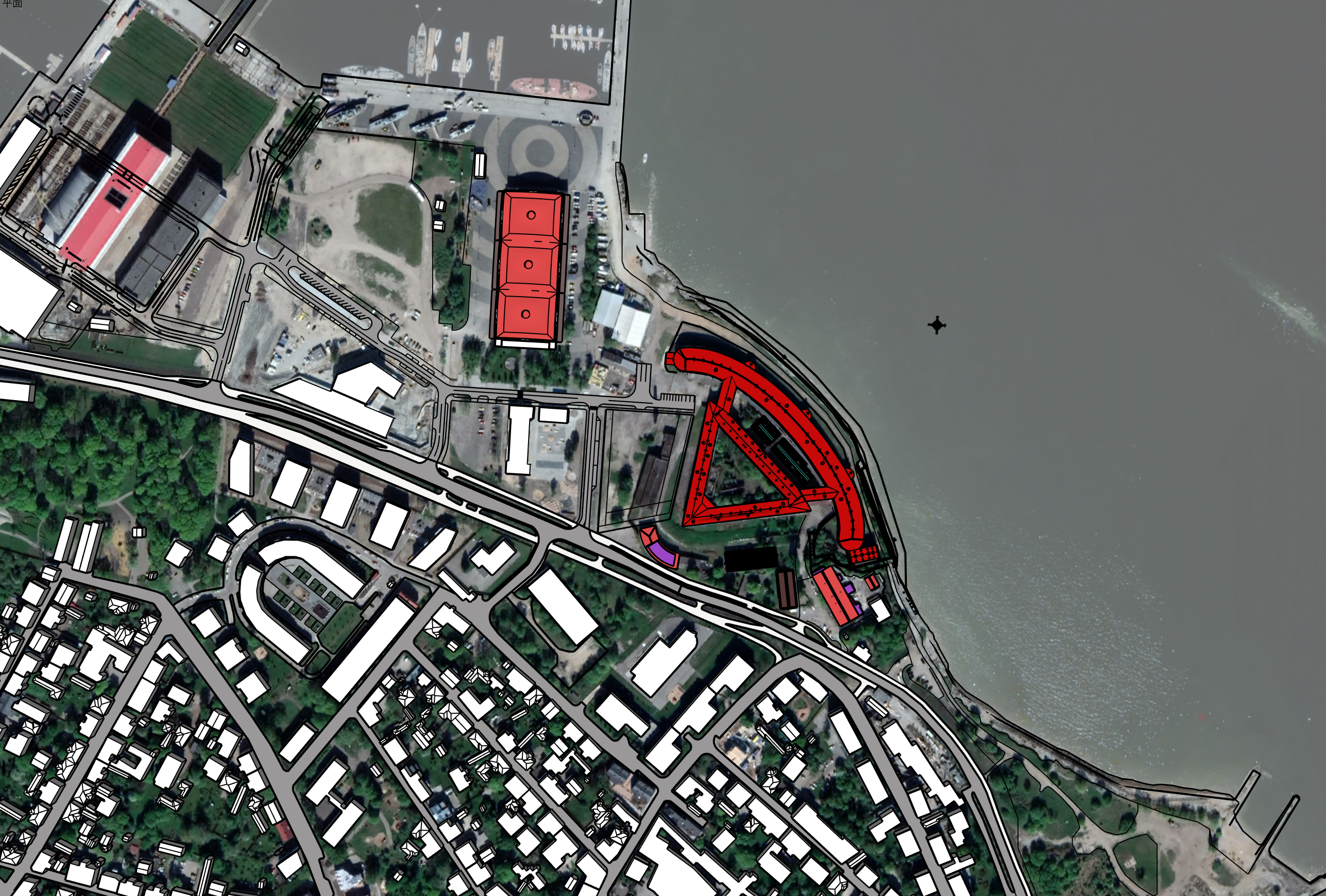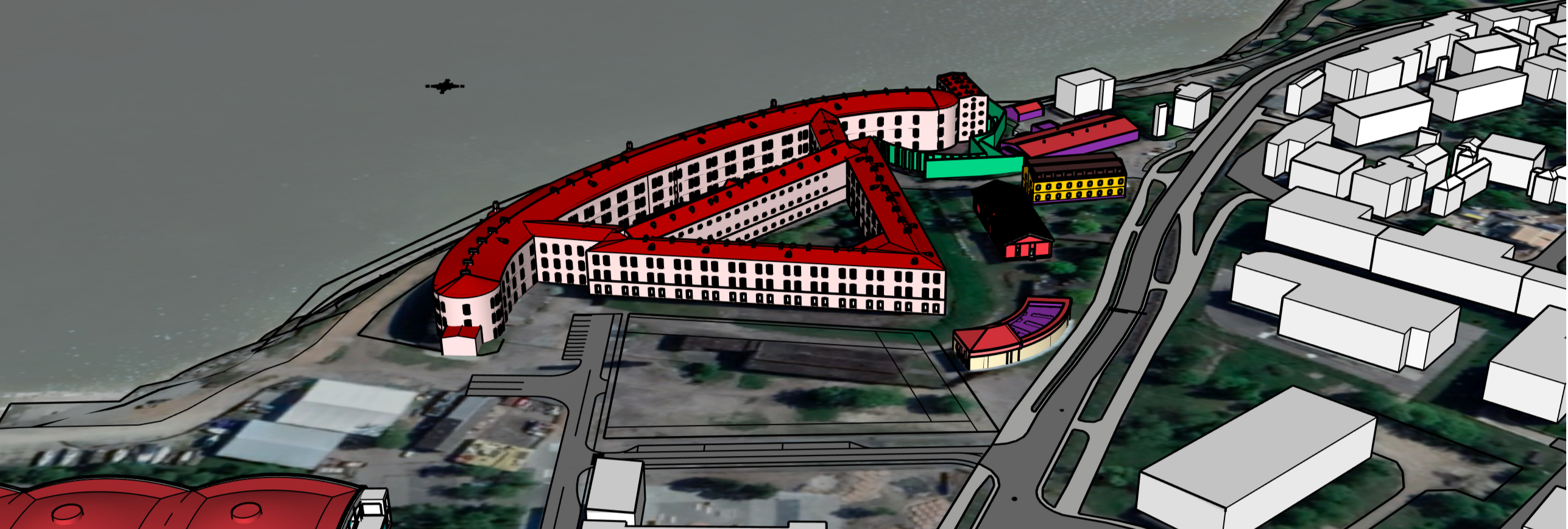 コンペ対象敷地(エストニア・パタレイ)を含む地形および周辺コンテクストの SketchUp によるモデリング. SketchUp のジオロケーションモデルに GoogleEarth の映像, Placemaker の建物ボリュームを合成, 道路ラインはトレース, 計画エリア周辺は CAD データを取込み, 総合的にモデリングしたサイトに、支給された建物データのポリゴン数をある程度レデュースして配置.