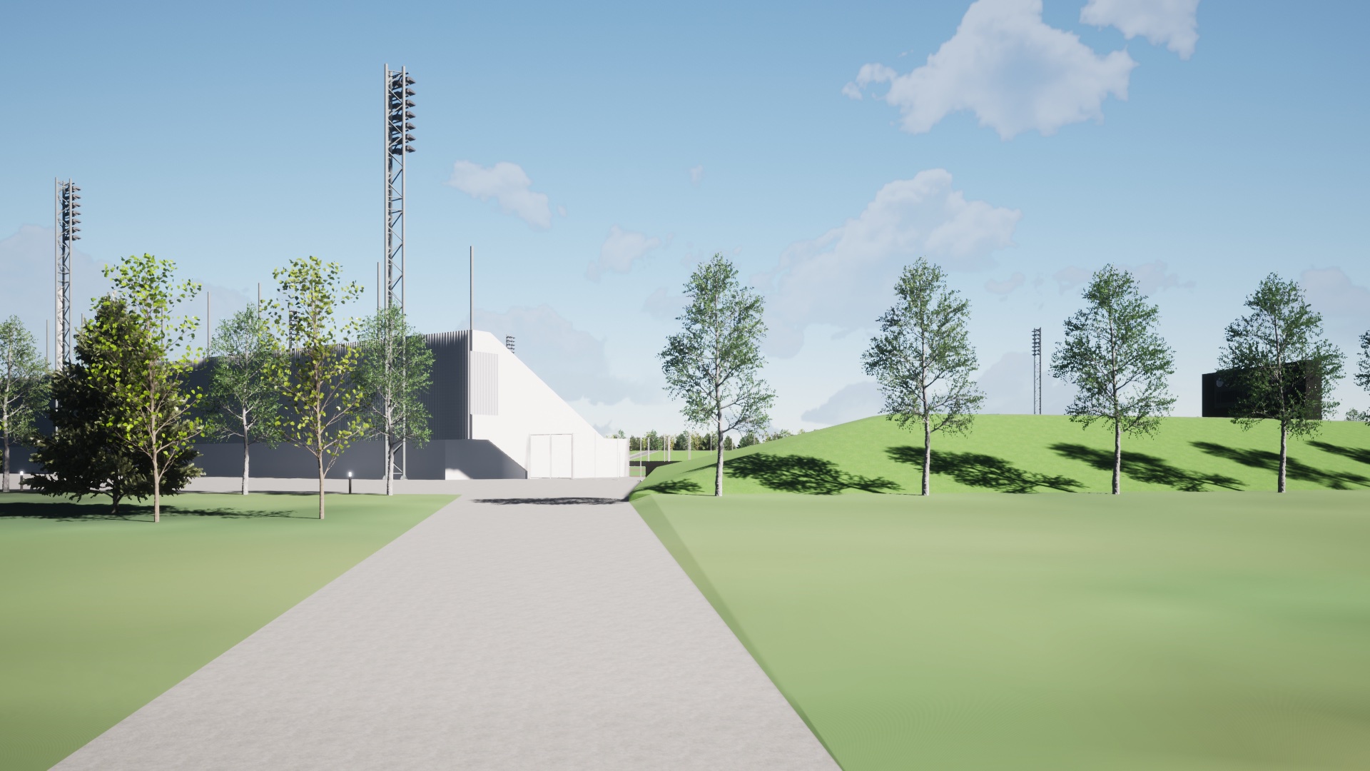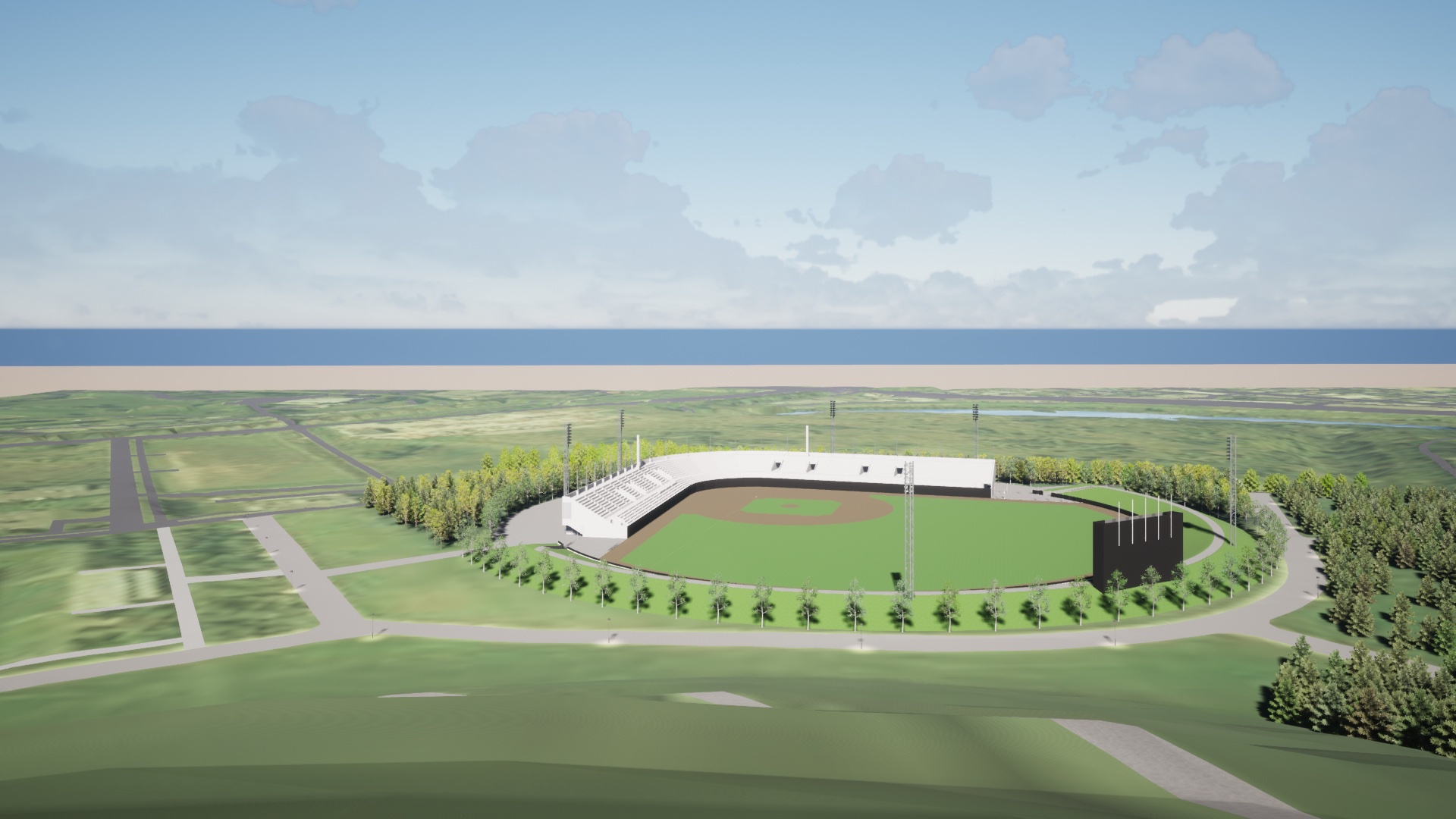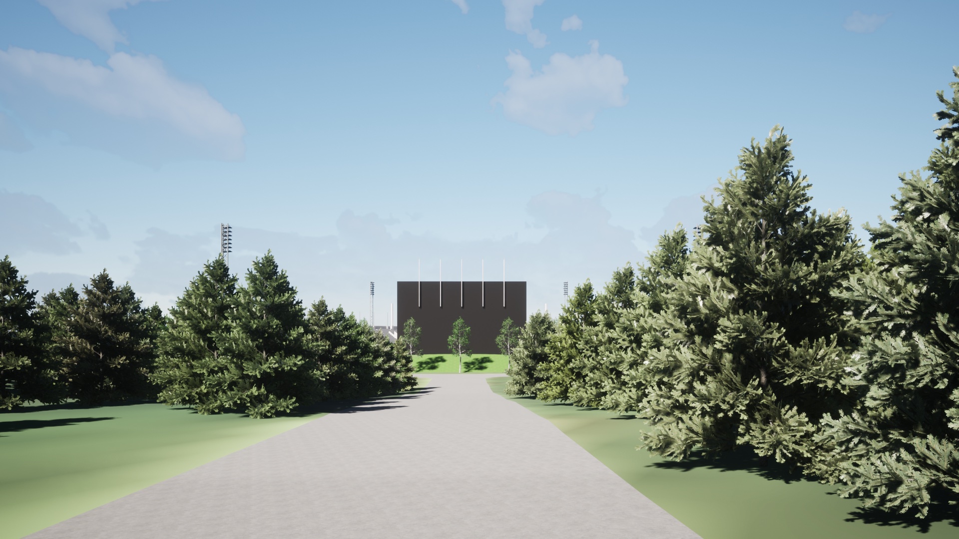 Basic design of the baseball field and surrounding area, modeled in SketchUp, and presented in Twinmotion