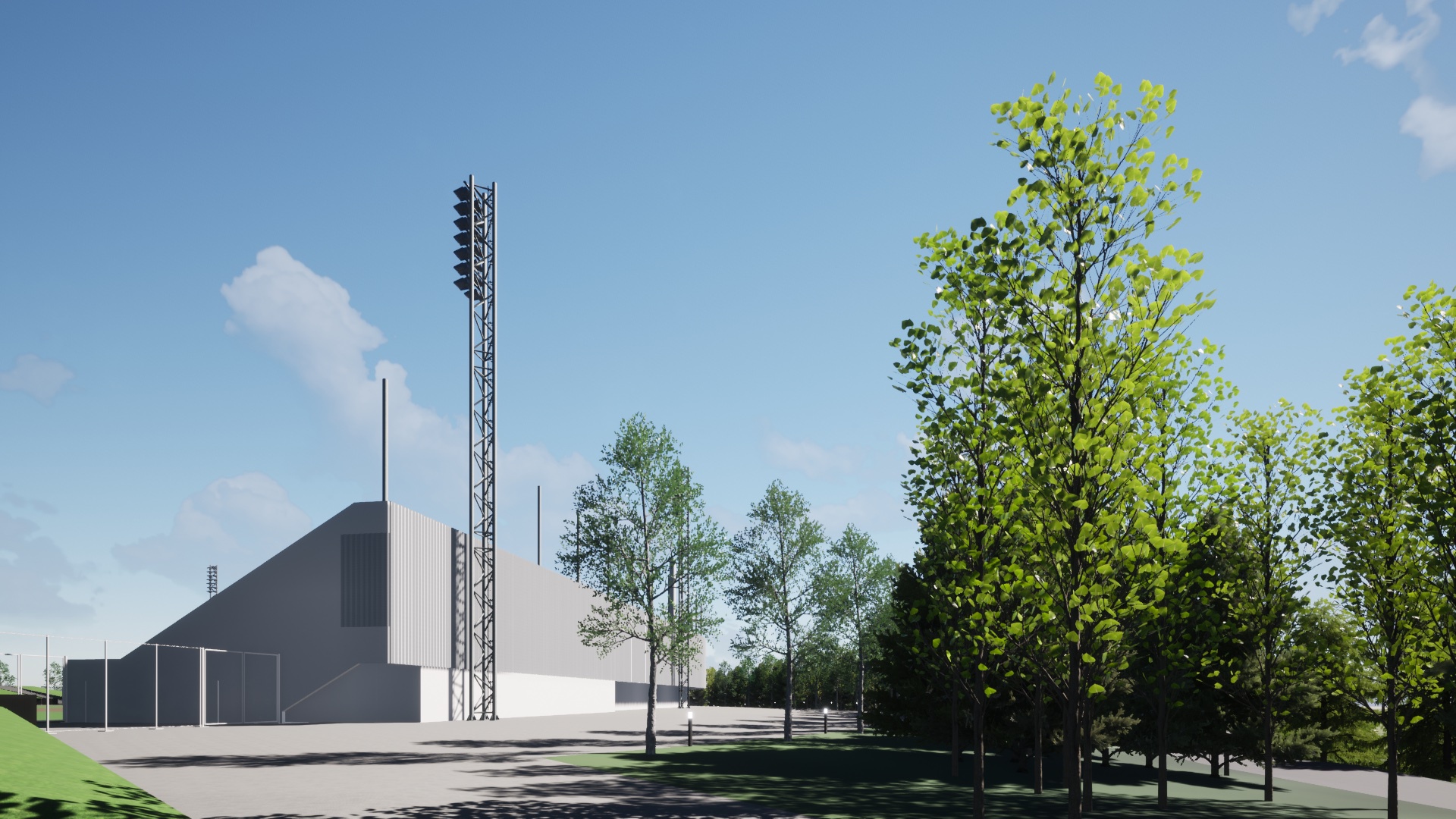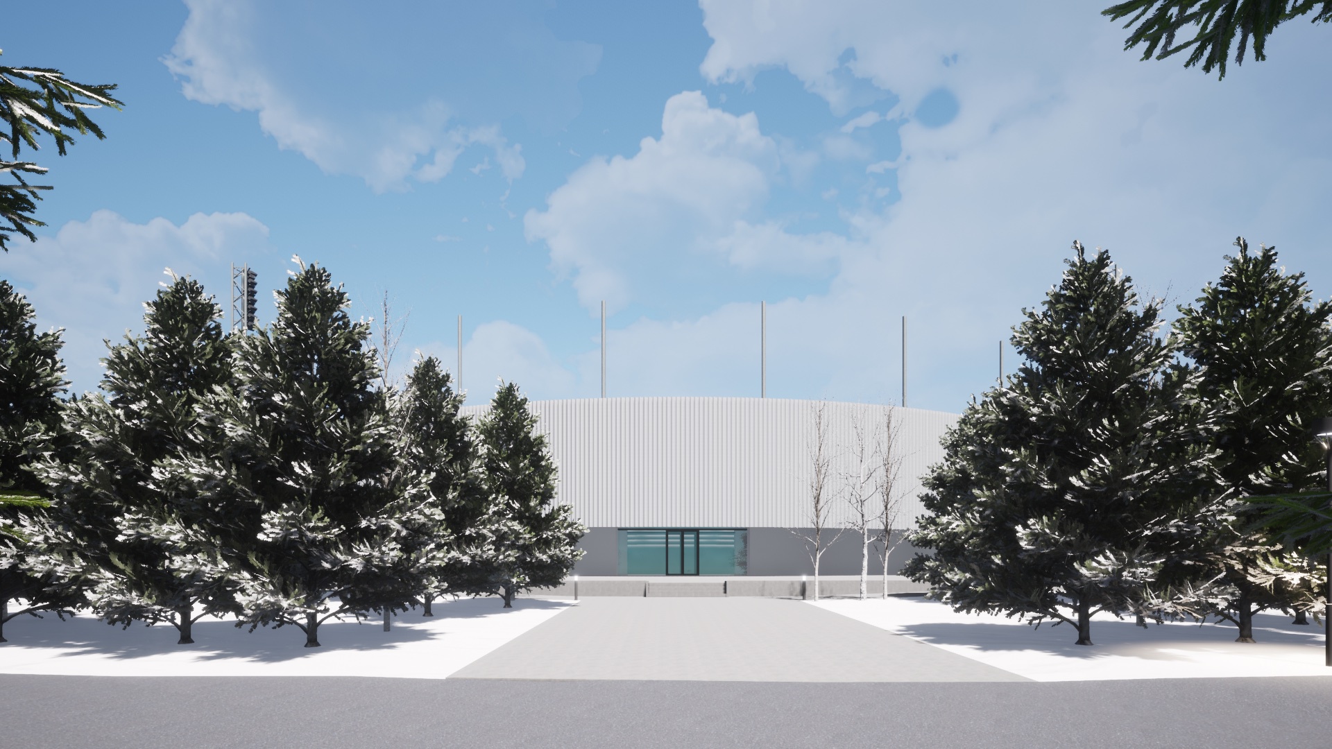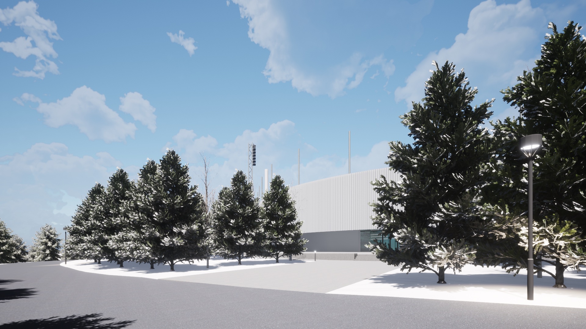 Basic design of the baseball field and surrounding area, modeled in SketchUp, and presented in Twinmotion