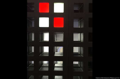 格子パターン・ファサードデザイン。格子状に組み込まれたLEDランプは、キャビンアテンダント(CA)のコールや緊急時に作動します。