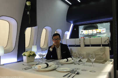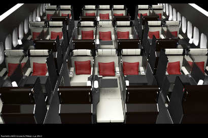 ファーストクラスを完全個室可能なモジュールユニットで構成。航空機内のG対応、強度にも優れ、スライド・ソファーシステムによりラウンジ、レストラン、キングサイズベットと様々な仕様に変化することが大きな特徴。室内の大型モニターでは次世代のコミュニケーション、エンターテイメントを満喫できます。