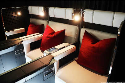 配列はもっともキャパシティの高い2-3-2レイアウトのビジネスクラス。中央席のパッセンジャーが両脇を気にすることなく運用できます。イメージの中央席はフルフラットにした時の様子です。