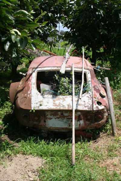 Whenever I go to California, I have a car that I always want. Porsche 356 Speedstar. The reflection reflected on the body reflects the beauty that cannot be imagined in this world. This car is like a magic mirror that beautifully reflects the world. The Fiat 550, Cinquicento, visible over there, is accompanied by flowers. I feel happy.